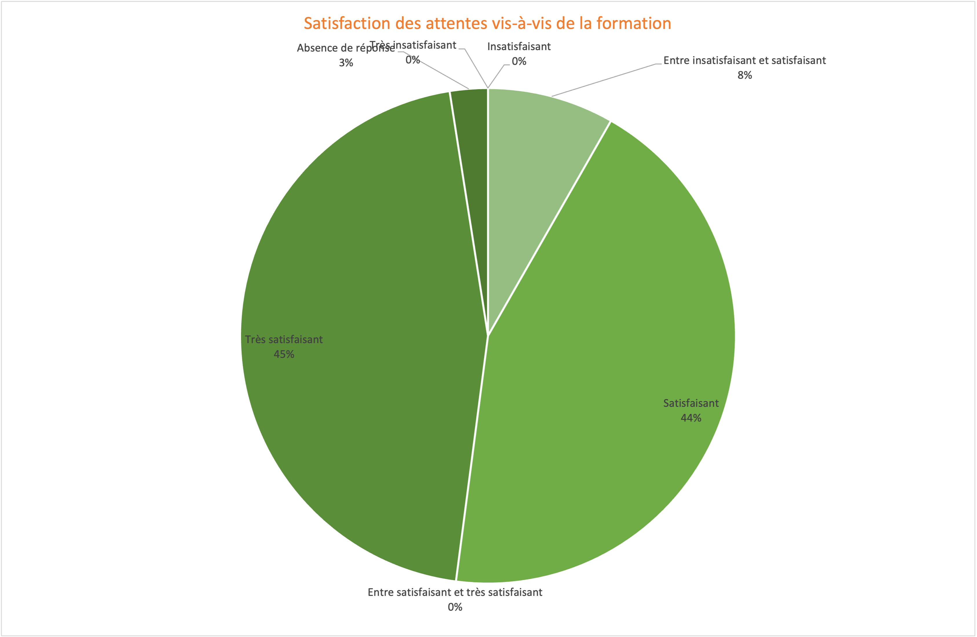 Parmi ces personnes, seul 8% des participants sont moyennement satisfaits de nos formations, 44% sont satisfaits et 45% sont très satisfaits de nos formations (ces chiffres sont en légère évolution depuis 2024 : 43% des participants étaient satisfaits de nos formations, 10% entre satisfaits et insatisfaits, et 44% très satisfaits, nous espérons continuer dans cette voie).